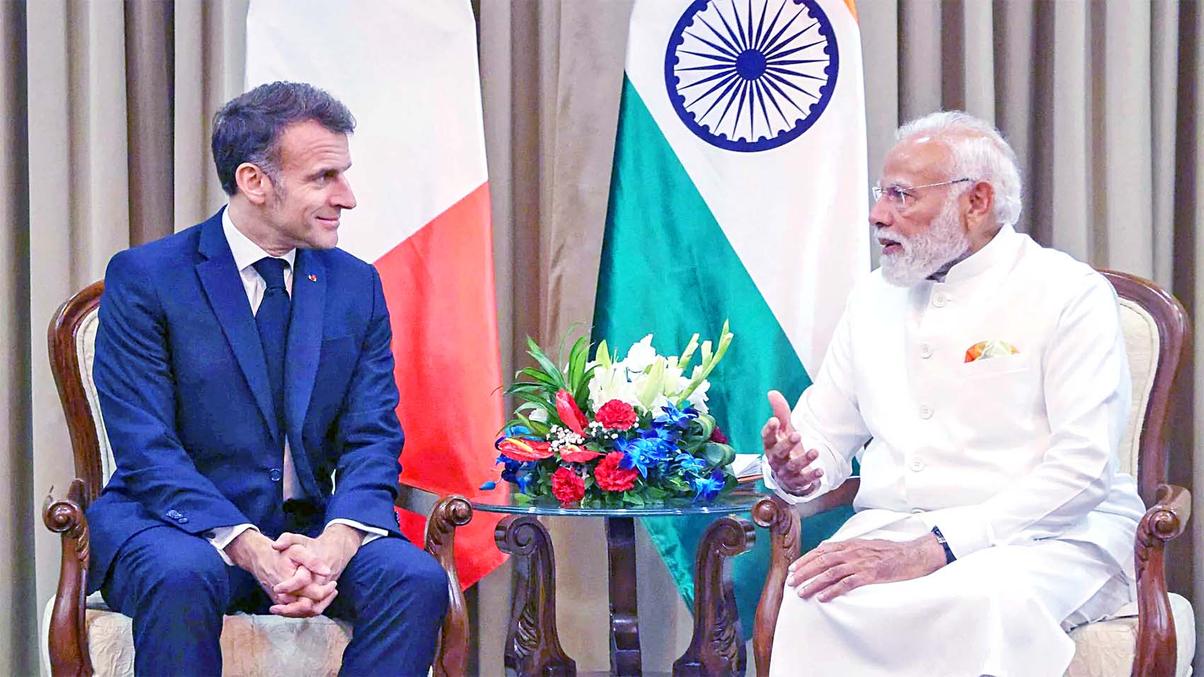 મુંબઈમાં ફ્રાન્સના પ્રેસિડન્ટ ઇમૅન્યુઅલ મૅક્રૉન અને ભારતના વડા પ્રધાન નરેન્દ્ર મોદી વચ્ચે દ્વિપક્ષીય બેઠક દરમ્યાન સંર...