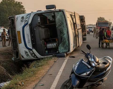 પાટણ- હારીજ-ચાણસ્મા હાઇવે પર પર લકઝરી બસ પલટ...